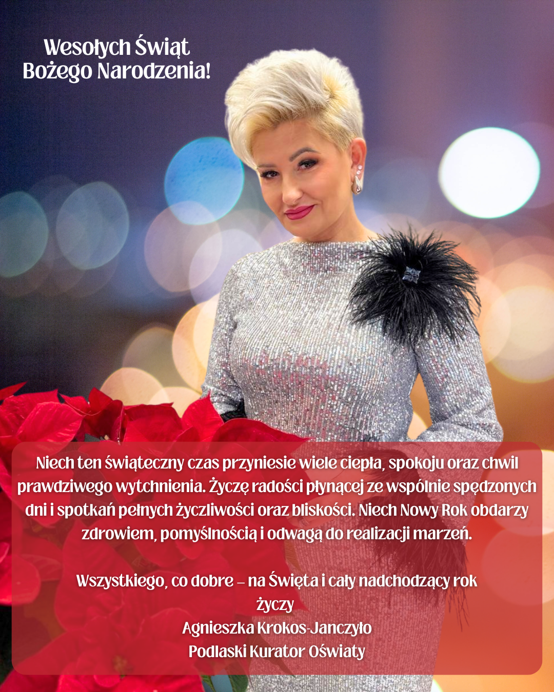 Świąteczne życzenia Podlaskiego Kuratora Oświaty Nawigacja wpisu Poprzedni Poprzedni wpis: Niebo – Ziemi, Niebu – Ziemia; Wszyscy wszystkim ślą życzenia :DNastępny Następny wpis: Życzenia Bożonarodzeniowe 2025 Może Ci się spodobać: Linia Budy Stawiskie – Stawiski przez Zaborowo Zawołani po imieniu – zmina terminu uroczystości Pod biało-czerwoną – inicjatywa zakupu masztu i flagi X Przegląd Kolęd i Pastorałek